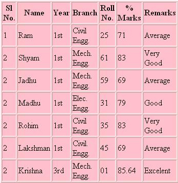 <td>2</td><td>Shyam</td><td>1st</td><td>Mech. Engg.</td><td>61</td><td>83</td><td>Very Good</td>